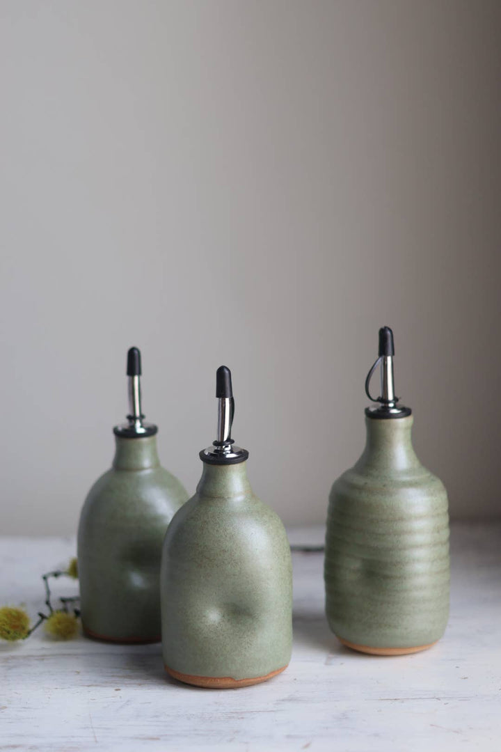 The handcrafted ceramic cruet combines form and function with a dash of sustainable swagger - it's made from our recycled studio clay, giving each piece its own unique personality. The matte green finish and elegant proportions make it a counter-worthy statement piece, while the stainless pourer with cap keeps your fancy olive oil fresh and ready for action. Perfect for restaurants looking to elevate their tableside service or shops catering to home chefs who appreciate the perfect drizzle. * limited edition one of a kind matte green olive oil bottles * holds approximately 10 oz * measures approximately 9” high with pourer x 3-3.5” diameter * cork and stainless oil pourer with cap * removable lid has a clasp to keep your oil fresh * no two are quite the same - we embrace and celebrate the variations of handmade pottery * clay may vary from medium to buff stoneware. We make these lovelies using our studio recycled clay! * dishwasher safe *