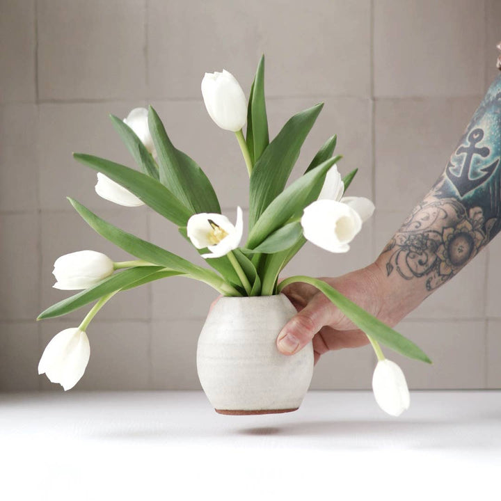 Simplicity meets function with the handmade Artist Choice Small Vases. The assorted styles are all wheel thrown and altered one of a kind small vases perfect for a small bunch of flowers. We love these for summer garden flowers or weddings. - stoneware - wheel thrown by real humans - one of a kind - even when we make a batch of a form, each one ends up with its own unique personality and that is what we love about handmade - holds 5-8 tulip stems for reference or 10-12 standard ink pens - measures approximately 2.5- 3" wide x 2.5-3" high - wabi sabi style glaze - glazed interior makes it easy to clean - we will choose an assortment for you