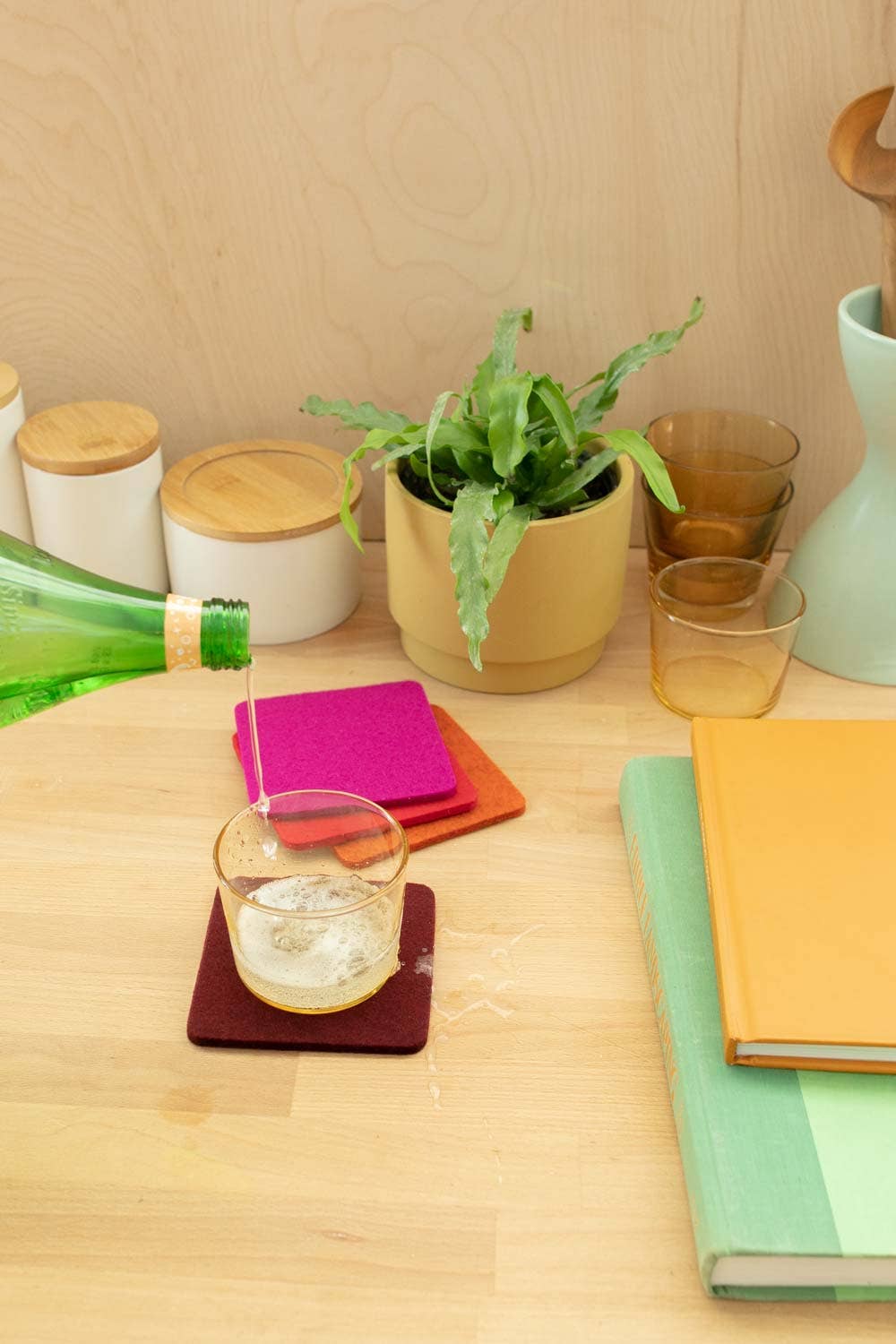 Coasters That Work Wool is the most hydrophilic of all natural fibers, absorbing as much as 30% of its weight without feeling wet. Our traditional Bierfilzl ("Beer Felt") are the highest quality German merino wool felt coasters on the market today. Their clean and minimal execution offers an unexpected textural and refined modern heritage element to any home decor. Set includes 4 hand-cut heavy duty 5mm thick wool felt coasters to provide extra surface protection. --- * 5mm merino wool felt * Includes 4 coasters in burgundy, fuchsia, red, heather and orange * Made in USA *