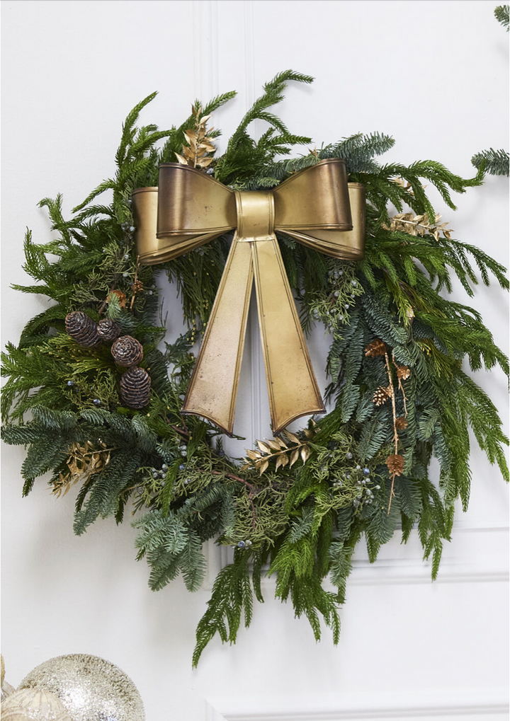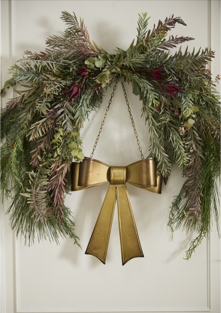 Create a festive and inviting entryway with the Bow Wreath, a lightweight, large-scale metal bow with an aged brassy finish. This classic bow hangs from a gold chain and can be styled as a singular piece, or looks stunning layered onto a fresh wreath of greenery. Double layered loops give this style lots of dimension and the aged finish is a nostalgic nod to vintage holiday decor. We recommend styling on a door that has an overhead covering or bringing this beautiful bow inside for a fresh holiday display!