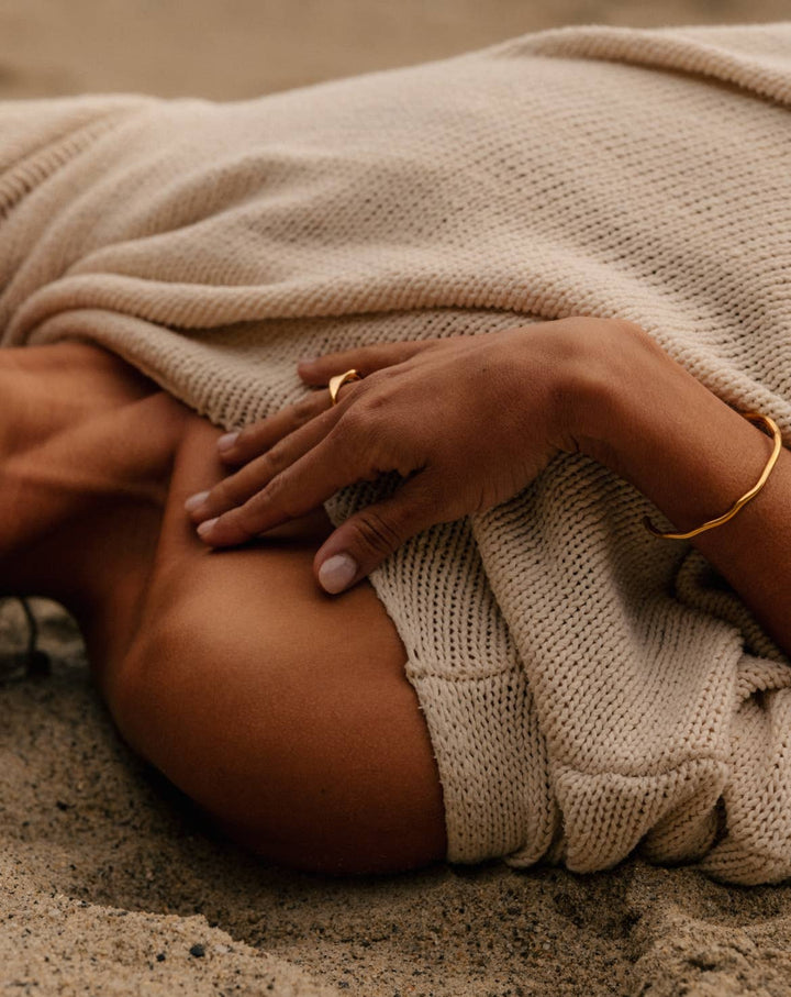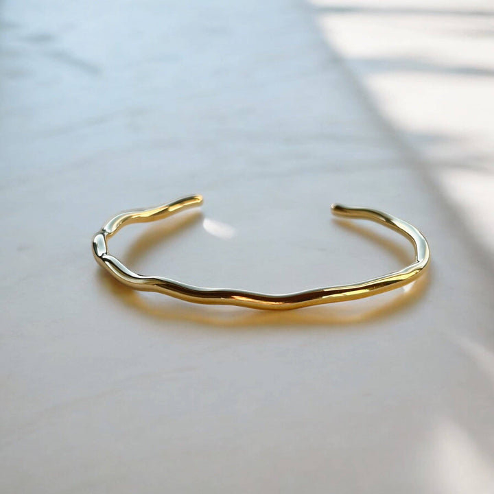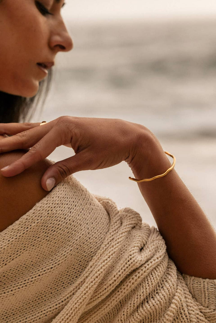 Our Calista Cuff Bracelet is a sleek, skinny gold cuff with a subtle, wavy design that evokes the fluid motion of ocean waves. Perfect for adding a touch of elegance and natural flow to any outfit
