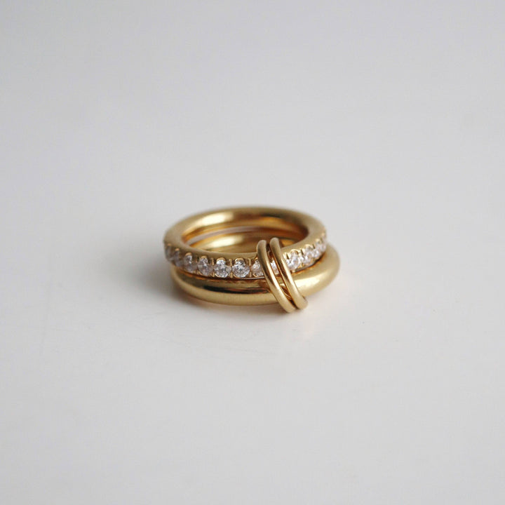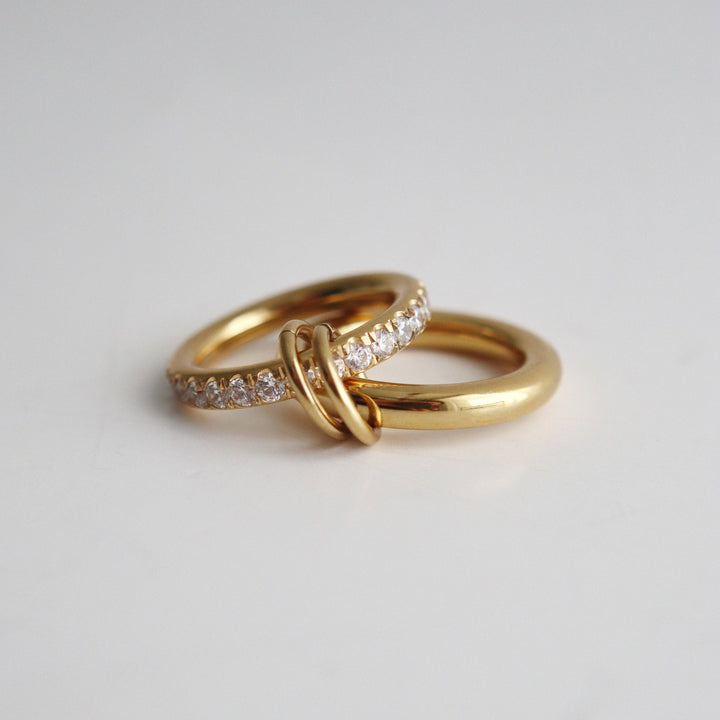 The Cecilia Ring features two linked bands, one band is sleek and smooth while the other is adorned with a row of sparkling cubic zirconia stones. Perfect for making a glamour statement, this piece balances luxury with a contemporary edge, ideal for a night out or special occasions.