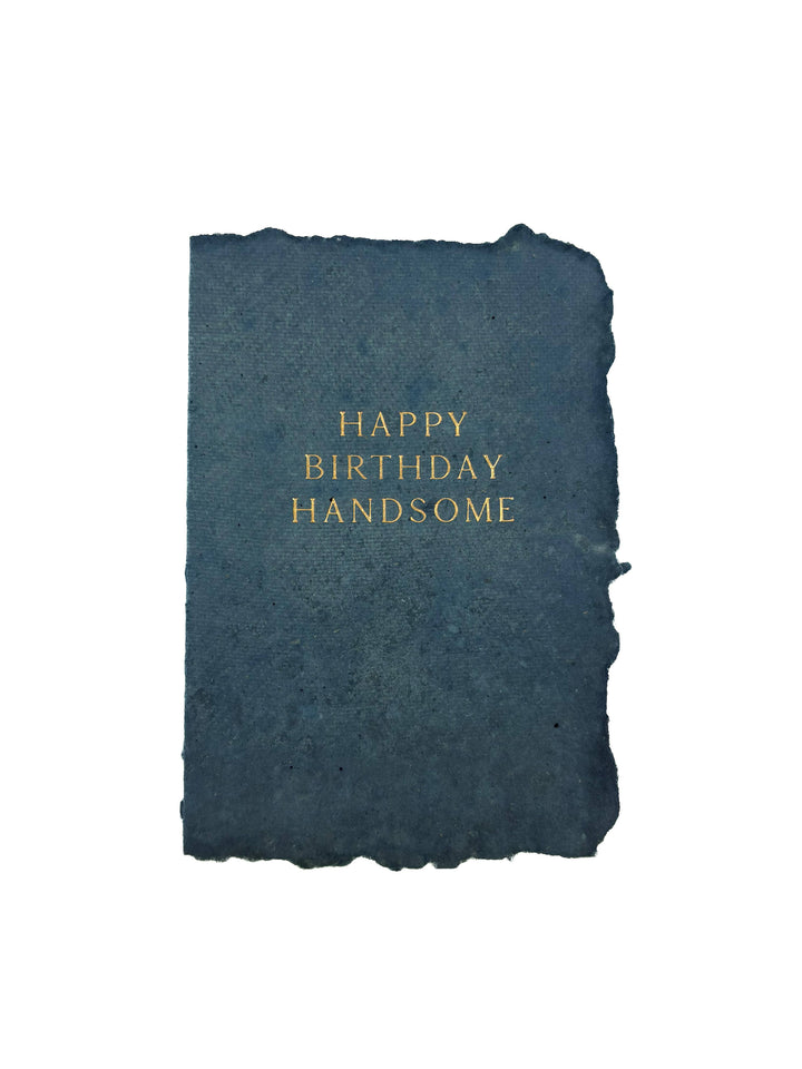 Deep indigo handmade paper with gold foil. Handmade paper card with four full deckled edges, hand folded with inside blank. Front is foil printed; back is letterpress printed with a small note including information about the natural dyes used to color each unique piece of paper. Comes with a textured, harvest white A2 envelope and a small card matte printed with photos and a little information about our process.