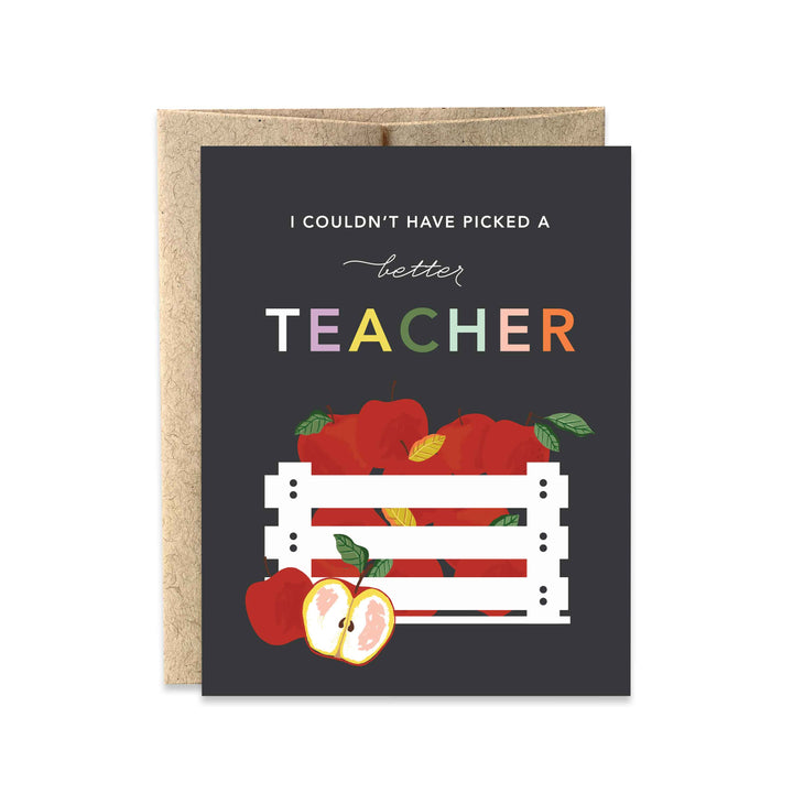 Reads "I couldn't have picked a better teacher" with hand drawn apples in a farmhouse crate and sweet colors. Perfect for any teacher!