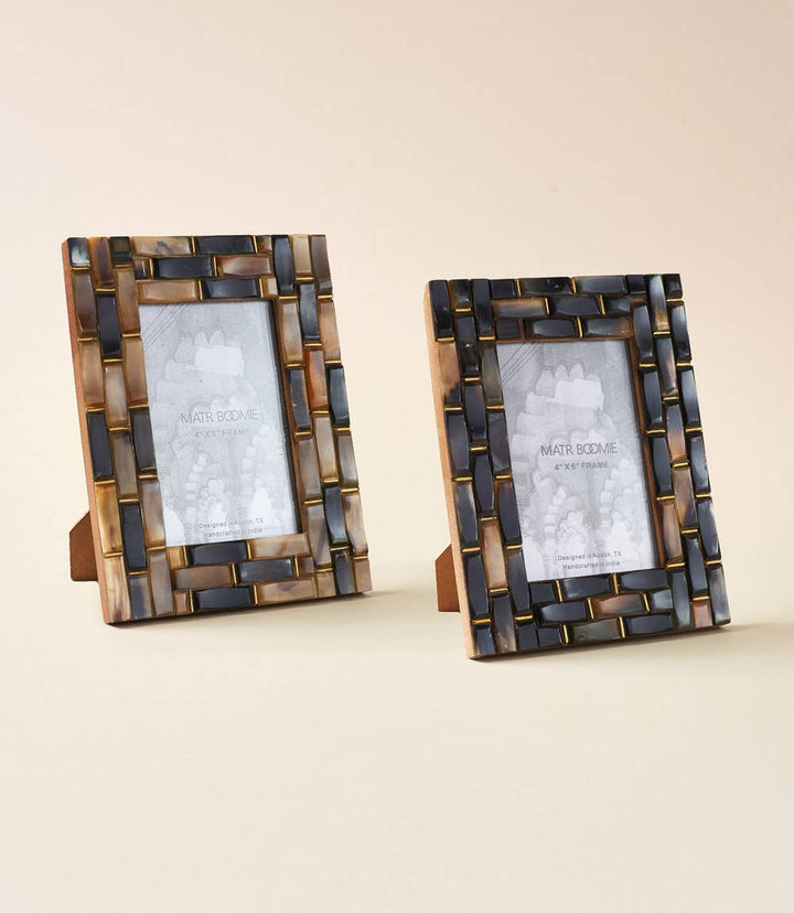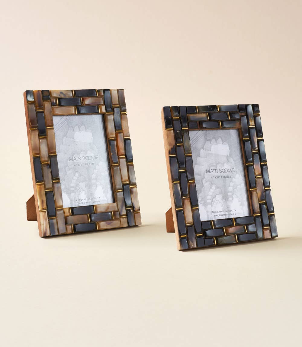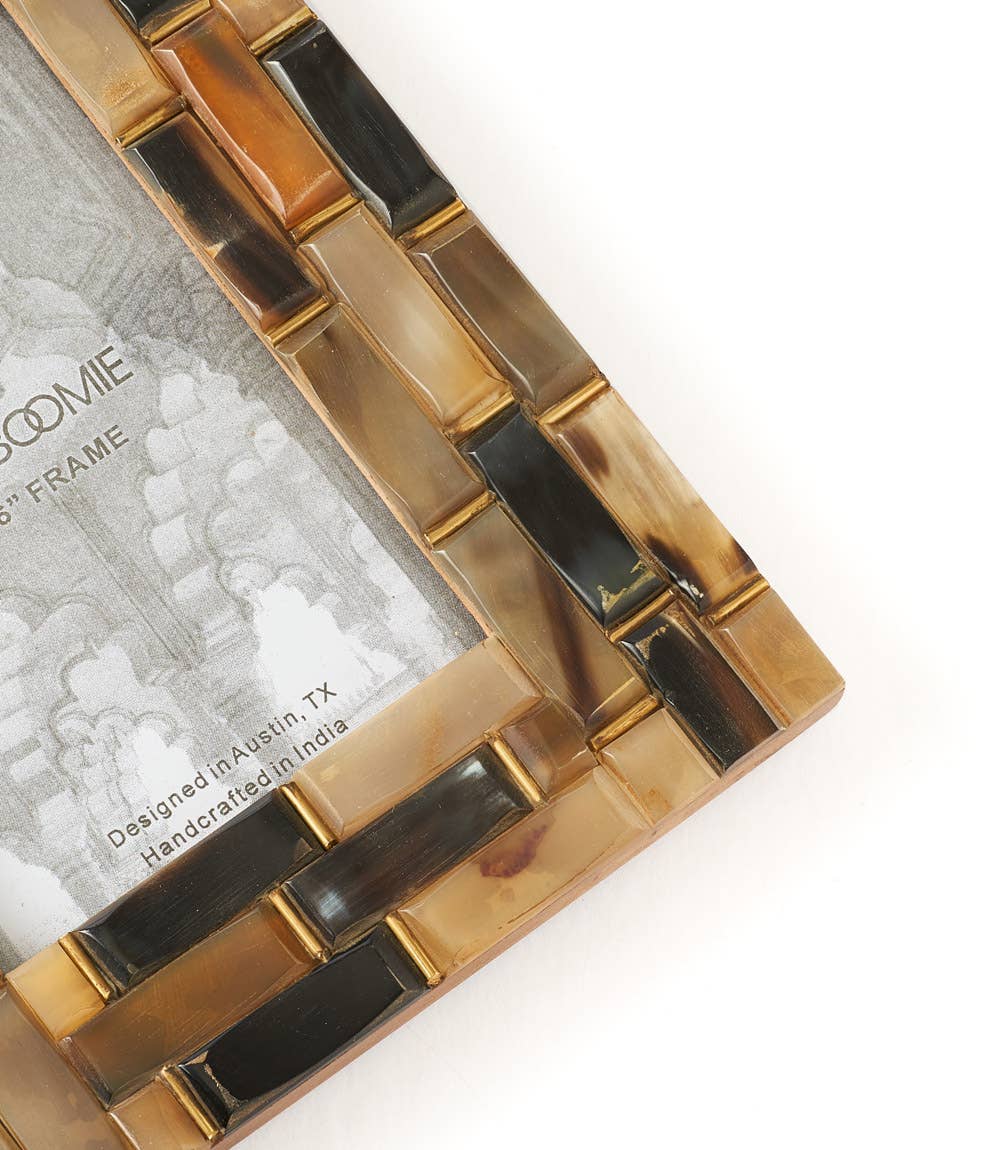 The Kachhua Beveled Picture Frame features variations of hand carved horn with brass accents. Ranging from darker to lighter tones each frame is one-of-a-kind with a unique tortoise shell like effect. The varied, earthy tones would blend well with different aesthetics and elevate an interior space. Would make a great gender neutral gift for him or her. Display this photo frame on a wall, shelf, dresser or desk. Frame features a two-way easel back, metal swivel tabs to access opening, glass cover and a metal d-ring for hanging vertically. There will be natural variations of horn in each frame, some darker, some lighter. Photos are just an example. All of Matr Boomie's collections are artisan made, fair trade, and sustainable.