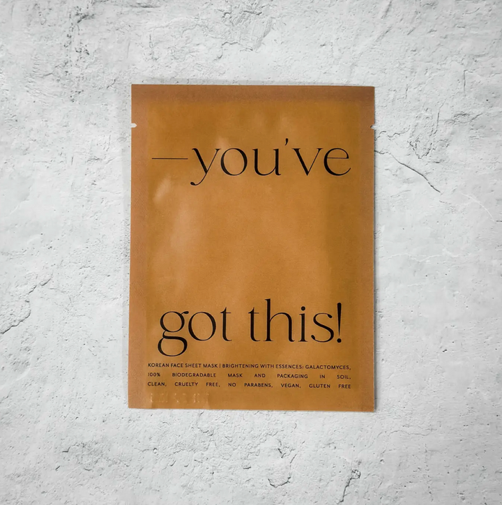 You've Got This- An illuminating and brightening sheet mask that makes you glow from the outside in and more than ready to take the day on. Made from sustainably sourced Tencel, a 100% biodegradable skin-friendly material that can fully revert to nature, it is dipped in powerful essences, and acts quickly to restore and improve the skin. What it is A Korean sheet mask with brightening and anti-aging properties. What it does Brightens skin tone, strengthens skin moisture barrier, has anti-aging properties Key Ingredients Galactomyces Skin Type All skin types, dull skin, weakened skin