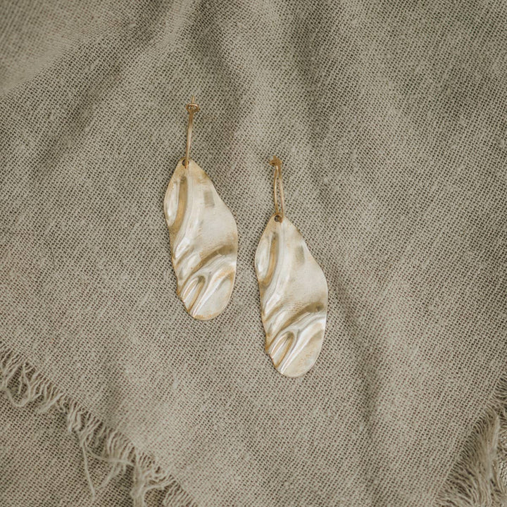 Dynamic, textured brass pieces hang from small, 1/2” brass hoops.