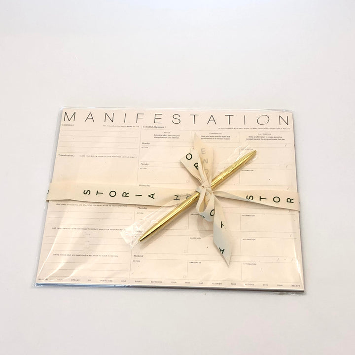 A cross between a manifestation journal and a desktop planner, the Manifestation Pad is a step by step guide to start manifesting now. Includes six months of manifestations, and a gold ballpoint pen, to write out your manifestations in style!