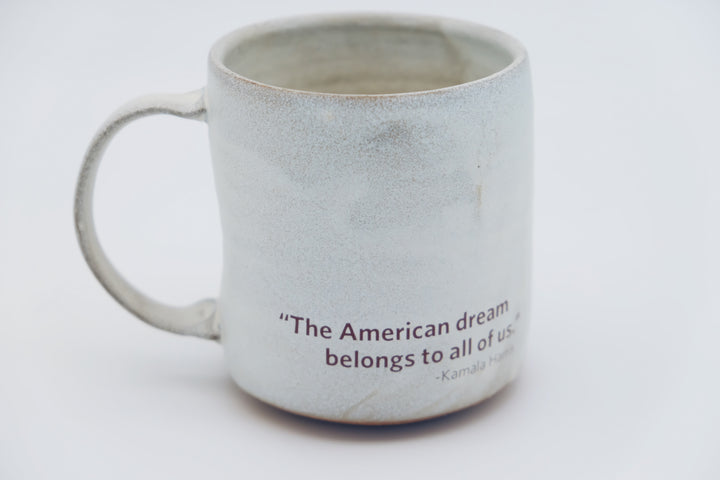 Crafted from high-quality ceramic material, this minimalist mug features two powerful quotes from presidential candidate, Kamala Harris. The matte cream glaze is beautifully rustic adding a wabi wabi feel to our modern pottery. Perfect for any fan or supporter, this mug is a must-have for any collection. Show your support for this influential political figure with every sip.