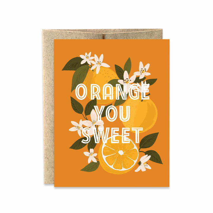 Reads "Orange You Sweet" with hand drawn orange artwork.