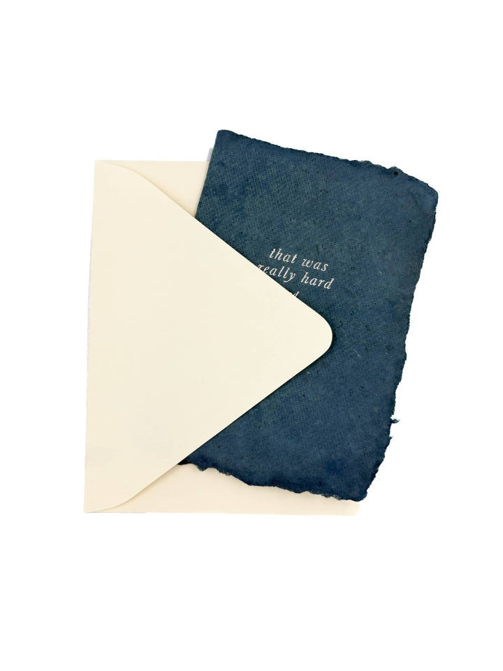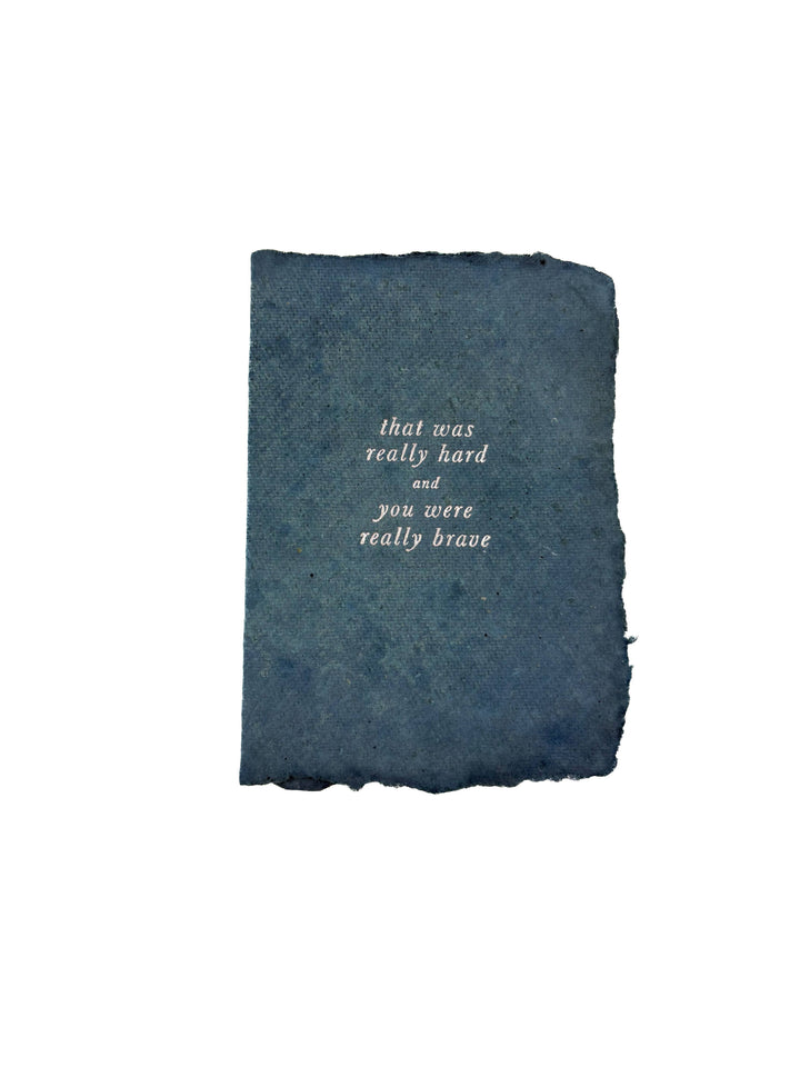 Deep indigo handmade paper with silver foil. Handmade paper card with four full deckled edges, hand folded with inside blank. Front is foil printed; back is letterpress printed with a small note including information about the natural dyes used to color each unique piece of paper. Comes with a textured, harvest white A2 envelope and a small card matte printed with photos and a little information about our process. Card reads "that was really hard and you were really brave". Wholesale only: MOQ